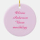 Dieses Ornament zeigt ein niedliches weißes Storch mit schwarzen Schwanz-Federn, die auf einem hellrosa Deckenbündel haften. Auf dem Bundle ist rosa Text, der "Baby Girl" sagt. Dieses Design ist ideal, um ein kleines Mädchen zu feiern. Es gibt einen eigenen Text, damit Sie den Namen Ihres Babys und ihr Geburtsdatum angeben können. Dieses Ornament würde eine wunderbare Geburtsankündigung oder ein Geschenk für eine neue Mutter machen, sowie ein schönes erstes Weihnachtsgeschenk.