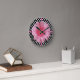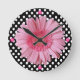 Hübsche dekorative Wanduhr aus schwarz-weißem Polka-Punktmuster. Eine rosa, grafisch verbesserte Gerber-Blüte, dekoriert die Mitte, und vier rosa Tasten kennzeichnen die Viertelstunde. Anpassen, um jeden gewollt Text hinzuzufügen. Stilvolle Uhr, die eine tolle Geschenkidee macht.
