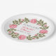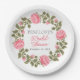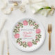 Verzieren Sie Ihren Brautparty-Tisch mit diesen schicken botanischen Brautparty-Papier-Tellern mit einem Kranz von blühenden rosa wilden Rose und elegantem grünem Blattwerk und BRAUTPARTY in elegantem Schriftart. Ideal für Landschaftsfeiern oder Gartentheater Brautparty mit rustikaler, aber eleganter Touch.