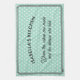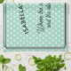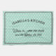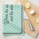 Ein stilvolles Küchentuch im hellen Aqua, gemustert mit weißen Polka-Punkten. Die Beschriftung lautet "Name)'s Kitchen. Wo die Kuchen gemacht werden und die Geschichten erzählt werden". Das hübsche Teetuch kann mit einem Namen personalisiert werden und ist ein ideales Geschenk für Liebhaber des Kochen und Backens.