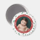 Hübscher Baby's erster Weihnachtsmagnet mit einem runden Foto Ihres Babys mit gekrümmtem Foto und hübschem roten Beeren- und Grünmuster und niedlichen Herzen. Gib deinem Kühlschrank eine festliche Touch mit dem ersten Weihnachtsmagneten dieses Babys, personalisiert mit dem Namen und Foto deines Freudenbündels!