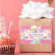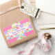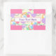 Ein Aufkleber in Candyfloss rosa, mit Kreuzen von bunten Kreisen und Ringen, wie ein Band um ein Geschenk. Der Aufkleber kann mit einem Namen, Dankeschön-Nachricht oder einer anderen Formulierung Ihrer Wahl personalisiert werden. Behalt etwas Praktisches zum Abdichten von Einladungen, als Favoriten oder Benennen von Party-Taschen für Kinder, und als hübsches Zubehör für Kinder, um an ihren Besitztümern zu haften.