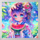Hübsche Aquarellkunst, die ein niedliches Anime-Mädchen mit lila Haaren zeigt, die Wassermelonen an einem heißen Sommertag essen.