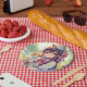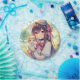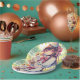 Teller der Geburtstagsparty. Anime-Mädchen mit langbraunem Haar, rosa Schleifen im Haar, mit einem orangefarbenen und weißen Kätzchen, das einen Geburtstagshut trägt.