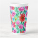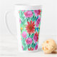Grüne, rosa, blaue und rote Blume und latte Tasse aus Blattwerk.