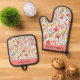 Ein Ofen Mitt und Topfhalter Set, gemustert mit Blume und Blätter im Aquarell-Stil. Die rot-gelben Blüten machen dies zu einem aufregenden Design, das der Küche eine Touch botanischer Eleganz und Sonnenschein verleiht. Ein ideales Geschenk für Gartenliebhaber.