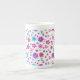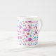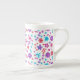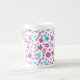 Eine hübsche Knochen-China-Tasse mit einem Muster an lila, türkisfarbenen, rosa und orangefarbenen Blume auf weißem Hintergrund, von Judy Adamson in einer handbemalten PapierCollage.