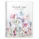 Das elegante, moderne Notizbuch mit blühenden lila, blauen und rosa Blume und blauen Beeren mit grünen Akzenten im weißen Hintergrund. Fügen Sie einen personalisierten Namen oder Text hinzu. Dieses Aquarell-Blume-Notizbuch ist ein perfekter weiblicher Akzent für Ihr Büro.