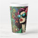 Farbenfrohe Kaffeemaschine mit hübscher Dame in Sonnenbrille im Blumengarten in Rosa und Grün.