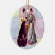 Vintage Malerei von zwei reizenden edwardian Damen in der Vintagen Kleidung in einem Raum mit zwei rosa Rosen auf einer hübschen dekorativen Tabelle als einer Dame, die ein Gold und ein lila Kleid trägt und ist daintely schauend und stehend, und die andere Dame trägt ein silbriges graues Kleid und hält eine Anmerkung.