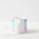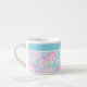 Eine sehr hübsche kleine Espresso Coffee Tasse, mit einem rosa Rosenmuster auf himmelblauem Hintergrund, gepunktet mit weißen Schmetterlingen: aus einem handgemalten Aquarellbild von Judy Adamson. Sie können dem schlichten Band oben Text hinzufügen oder ihn schlicht verlassen.
