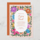 Diese prächtige Osterfeier-Einladung zeigt ein handgezeichnetes Blumendesign in magenta / fuchsienrosa, orange, goldgelb, lila, blau und grün auf einem farblich angepassten Hintergrund (in hellpfirsichfarben dargestellt). Ein ovaler Rahmen ermöglicht es, den passenden orangefarbenen Text zu unterscheiden. *Kunstwerke, die ausschließlich von Orabella Prints erstellt wurden
