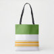 Dieses sportliche Design zeichnet sich durch breite federgrüne Oberstreifen und gelbe Unterkante doppelter horizontaler Rennstreifen und angrenzende schwimmende goldbraune Nadelstreifen aus. Der Hintergrund ist weiß.
