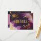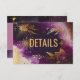 Diese luxuriöse Karte bietet einen lila Hintergrund, der mit atemberaubenden Goldfolienakzenten und zarten Blumenmotiven geschmückt ist und perfekt geeignet ist, um Hochzeiten, Galas oder andere Veranstaltungen mit einer Touch an Eleganz zu verbinden. Die fett gedruckte Aufschrift "DETAILS" in der Mitte ist durch eine Reihe von goldenen Blüten und Blätter gerahmt, sodass diese Karte eine exquisite Wahl für diejenigen, die feine Details und eine regelmäßige Farbpalette schätzen. Diese Karte ist ideal für Event-Informationen oder spezielle Nachrichten.