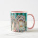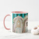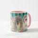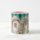 Diese hübsche Hütte Garden Tasse bietet Aquarelltüren, die mit Blume und Pflanze geschmückt sind. Diese schöne Blumenzene ist Set vor einem Hintergrund smaragdgrüner und aquamariner Streifen. Diese Tasse oder Tasse wäre ein großartiges Geschenk für einen Gärtner oder für jeden, der Blumenzauber, Landgarten-Szenen Lieben.