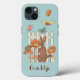 Fügen Sie mit diesem personalisierten Fall eine niedliche Touch zu Ihrem Telefon hinzu. Es zeigt ein hübsches Kernmotiv mit Abbildungen von Vögeln, Schmetterlingen, Kaninchen, Mäusen, Pilzen und einigen Blume mit einem Spot, um einen Namen in brauner Schrift oder kursiven Schriften hinzuzufügen. Die Grafiken sind Set vor einem hellblauen Hintergrund.