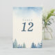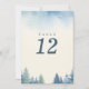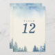 Diese Tischnummer-Karte zeichnet sich durch ein minimalistisches und dennoch elegantes Design aus, das durch eine große, fette Zahl gekennzeichnet ist, die auf der Karte zentriert ist. Der Hintergrund zeigt eine ruhige Aquarellwaldszene mit immergrünen Bäumen in sanften Blau- und Grüntönen, die den Boden und die Seiten umrahmen. Der subtile, scheue Himmel an der Spitze trägt zur friedlichen Ästhetik bei und macht diese Karte ideal für Hochzeiten und Veranstaltungen im Freien, im Wald oder im rustikalen Bereich. Die gepflegte und moderne Einrichtung sorgt für eine außergewöhnliche Tischnummer und ergänzt gleichzeitig das natürliche und ruhige Ambiente.