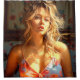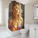 Dieser Duschvorhang hat eine hübsche Dame darauf abgebildet.