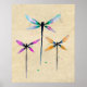 Hübsche originale Aquarellbild niedlicher Libellen in verschiedenen Farben vor rustikalem Hintergrund.