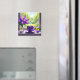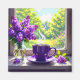 Ein hübscher Magnet mit einer prächtigen Illustration einer pulsierenden lila Lila, die in einer Glasvase auf einem Fenster sitzt, liegt neben einer dampfenden Tasse warmen Kaffees an einem hellen Sommertag.