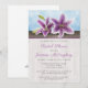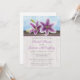 Lila Liliendusche mit rustikalem Chic-Design, exklusiv von Artistical Invited entworfen, mit zwei lila Lilien am oberen Ende, auf brauner Holzoberfläche, auf blauem Hintergrund. Ihre personalisierten Brautparty-Details sind in Braun und lila auf einem helleren Holzmuster-Hintergrund. Diese lila Lilienduschen eignen sich perfekt für Ihre Blumenhochzeit und Ihre Duschfeier. Passende Adressetiketten, Dankeschön-Karten und andere Artikel sind verfügbar.