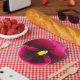 Hier können Sie Geburtstagskuchen und Desserts genießen, die mit farbenfrohen Tellern aus Papiertücher gestaltet sind und das Foto einer hübschen, lila-magentafarbenen Pansy-Blume mit gelbem Zentrum darstellen. Ein schönes, blumengeschmücktes Design! Wählen Sie Ihren Papierplattenstil aus.