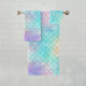 Hübsches Mermaid Scales Badetuch Set Hübsche Meerjungfrau Badetuch Set in rosa, blau und lila Meerjungfrau Muster mit Imitaten Glitzer.