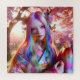 Hübsche, rosa und lila Frau mit mystischer Wirkung in einem ätherisch rosa, blumigen und schmetterlingsförmigen Hintergrund. Ihr Haar sieht aus wie ein hübsches Prisma.