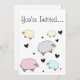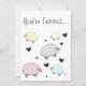 Eine Einladung mit einem niedlichen Schwarz-Herz-und Pastellton-Punkt Schaf-Design.