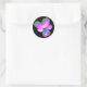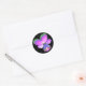 Dieses Rundaufkleber-Blatt zeigt ein Foto einer wilden Pansy-Blume. Das Foto wurde künstlich gefärbt, was zu einer Panik mit leuchtenden rosa lila Blütenblättern mit grünen Spitzen-Blättern und einem tiefblauen Zentrum führt. Der Hintergrund ist schwarz, um die Blume zu heben.