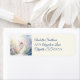 Eine hübsche Fee mit pastellrosa und orangefarbenen Flügeln mit blonden Haaren und einem weißen Kleid schwebt in einem schönen, zauberhaften, pastellfarbenen Blumengarten.