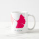 Eine personalisierte Kaffee-Tasse mit hübschem und modernem Stil. Machen Sie eine Aussage mit fett Farben und eine saubere und einfache Grafik. Es enthält Illustrationen von Ginkgo-Blätter in Marineblau, hellblütendes Rosa und einem hellen Korallengerbst Magenta. Diese Tasse ist bereit, mit einem Namen oder einem anderen Text in einfacher, navy blauer Schrift sowohl auf der Vorderseite als auch auf der Rückseite der Tasse personalisiert zu sein.