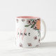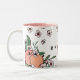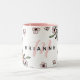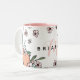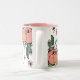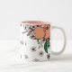 Schöne pfirsichfarbene Tasse mit Illustrationen von Pfirsichen, Pfirsichblüte, und Grün mit Ihrem Namen und Initial.
