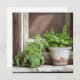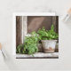 Leere Karte. Hübsche Pflanze, die auf einem rustikalen Holzfenster sitzen, beleuchten die Kunst der Luft.
