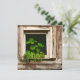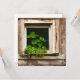 Leere Karte. Hübsche Pflanze, die auf einem rustikalen Holzfenster sitzen, beleuchten die Kunst der Luft.