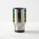Eine hübsche Travel Mug mit einem Muster von goldenen Schmetterlingen, handgemalt in Aquarell von Judy Adamson, auf einem aquamarinen Hintergrund, mit einem Band von schlichter Farbe am oberen Ende, das Sie personalisieren oder schlicht verlassen können.