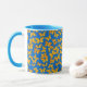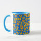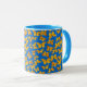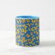 Eine hübsche Ringer-Tasse mit blauem Rand und Griff und goldenem Schmetterlingsmuster, handbemalt von Judy Adamson in Aquarell, auf himmelblauem Hintergrund.