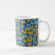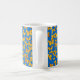 Eine hübsche Ringer-Tasse mit blauem Rand und Griff und goldenem Schmetterlingsmuster, handbemalt von Judy Adamson in Aquarell, auf himmelblauem Hintergrund.