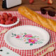 Papier Teller mit einem skurrilen Aquarellbild. Ein wunderschönes Blumenarrangement mit hellrosa und pastellrosa Farbtönen, eingebettet in grüne Blätter und Zierschriften.