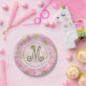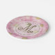 Feiern Sie einen besonderen Tag mit hübschen rosa Gänseblümchen und niedlichen, kundenspezifischen Tellern aus Monogramm. Pink Girly Girl Custom Gold Monogramm Blumendesign. Schöne und Baby-Puppe niedlich mit fröhlichen rosa Blume mit gelben und weißen Akzenten. Goldenes Monogramm, das auf einem goldenen und transparenten Hintergrund sitzt. Hübsche mädchenhafte Feierlichkeiten für ihren besonderen Tag.