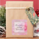 Business Aufkleber mit einem Foto mit einem Strauß rosa Nelken. Set auf einem traumhaften ätherischen Hintergrund.