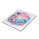 Hübsche tropische Oasis Kachel. Wunderschöne pastellrosa und blaue Küstenkunst mit Palmen, tropischen Blume, Sonnenuntergang und Meereswellen. Hübsche tropische Kunst, um Ihrer Zuhause ein Strandgefühl zu geben!