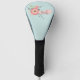 Hübsche Fahrer-Golfvereinabdeckung Dame erfolgt im Eiblau eines Rotkehlchens mit einem kleinen Polkapunktmuster. Grafiken einer korallenroten rosa Blumendekoration und -fahne, verziert die Mitte der Abdeckung. Personifizieren Sie den schwarzen Text, auf der Fahne, zum Anzug Ihr Bedarf. Große Geschenkidee. Wählte entweder Fahrerabdeckung oder Putterabdeckung.