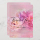 Vielen Dank Karte mit einem Foto mit einem Strauß von rosa und weiß Nelken. Set auf einem traumhaften ätherischen Hintergrund.