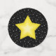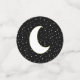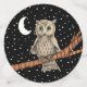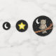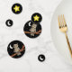 Dieser Tisch Konfetti ist schwarz überzogen mit kleinen weißen Sternen. Große Kreise haben eine hübsche braune Eule auf einem Zweig, die eine blaue Halskette trägt. Mittelkreise haben einen hellgelben Stern. Kleine Kreise haben einen weißen Halbmond.