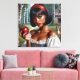Leinwand Wandkunst zeigt Ölgemälde einer großartigen braunhäutigen Schwarzen, die einen glänzenden roten Apfel halten. Sie trägt einen roten Lippenstift, ein rotes Kopfband im Bob-Haarschnitt, und ein Bauernkleid in einem Wald mit einem Hirsch im Hintergrund. Hyperfeminine Melanin-Kernästhesie. Märchenhafte Cosplay-Kunst von Dee Claire.