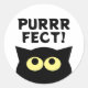 Hübsche schwarze Katzenaufkleber mit individuellen Zitaten. Niedliches Design mit Cartoon Kitty und humorvollem Zitat. Purfect! Fun Aufkleber für Tierliebhaber, Katzenbesitzer, Katzenfreund, Katzenmutter, Liebhaber von Haustieren etc. Die Silhouette der lustigen Katze mit großen gelben Augen.