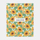 Decken mit einem niedlichen sommerlichen Muster. Hübsche gelbe Sonnenblumen, umgeben von grünen Blätter in einem sich wiederholenden Muster. Ein weißes Rechteck, oben platziert mit dem Text.