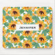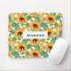 Ein Mousepad mit einem niedlichen sommerlichen Muster. Hübsche gelbe Sonnenblumen, umgeben von grünen Blätter in einem sich wiederholenden Muster. Ein weißes Rechteck, oben platziert mit dem Text.