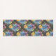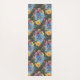 Hübsche Yoga-Matte-Design hat große, blaue Primärblumen mit kleineren Blumen in Gelb, lila und Rosa, alle auf einem kohlegrauen Hintergrund, sodass es ein dunkles und elegantes Aussehen.